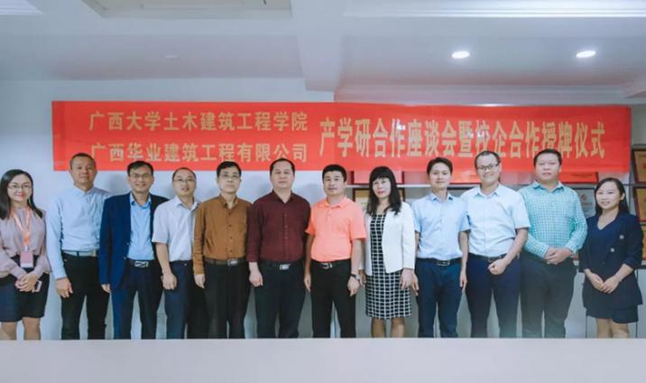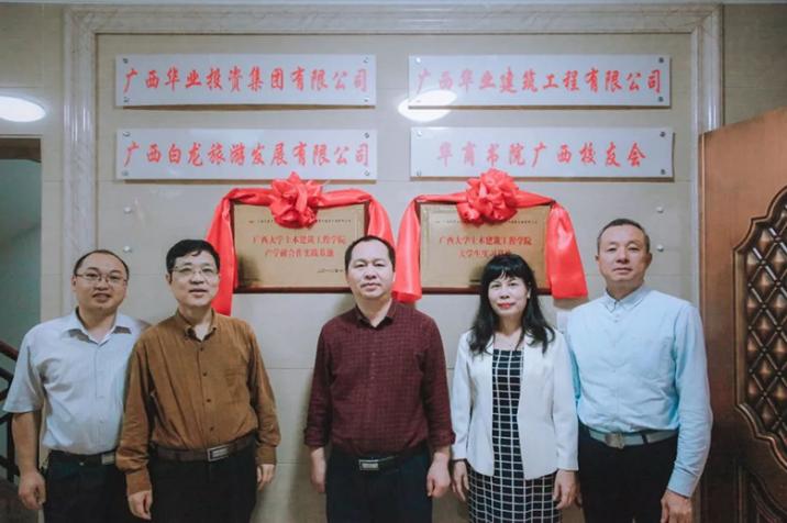 座談會(huì)后,雙方舉行授牌儀式,廣西大學(xué)在廣西華業(yè)建筑工程有限公司成立“廣西大學(xué)土木建筑工程學(xué)院產(chǎn)學(xué)研合作實(shí)踐基地”、“廣西大學(xué)土木建筑工程學(xué)院大學(xué)生實(shí)習(xí)基地”。
