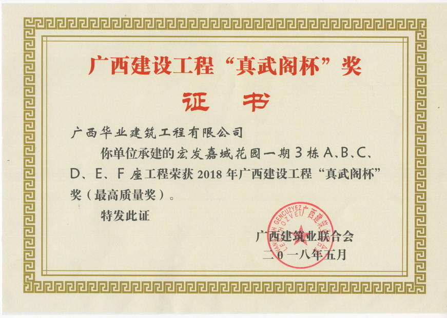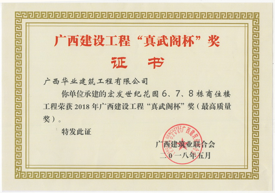 2018.5宏發(fā)世紀(jì)花園6、7、8棟商住樓工程榮獲2018年廣西建設(shè)工程“真武閣杯..