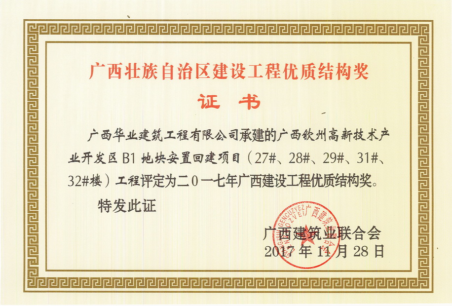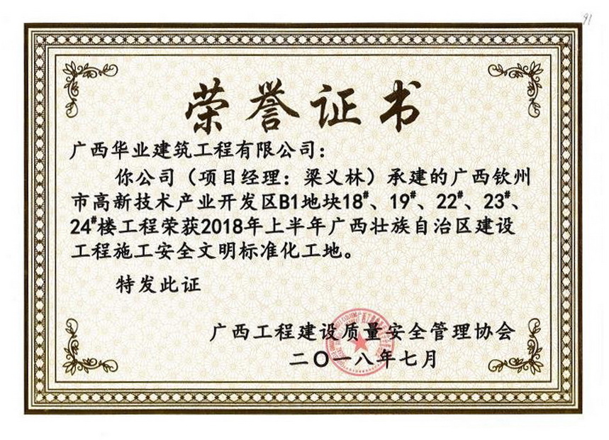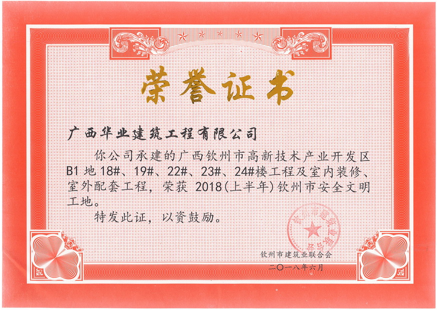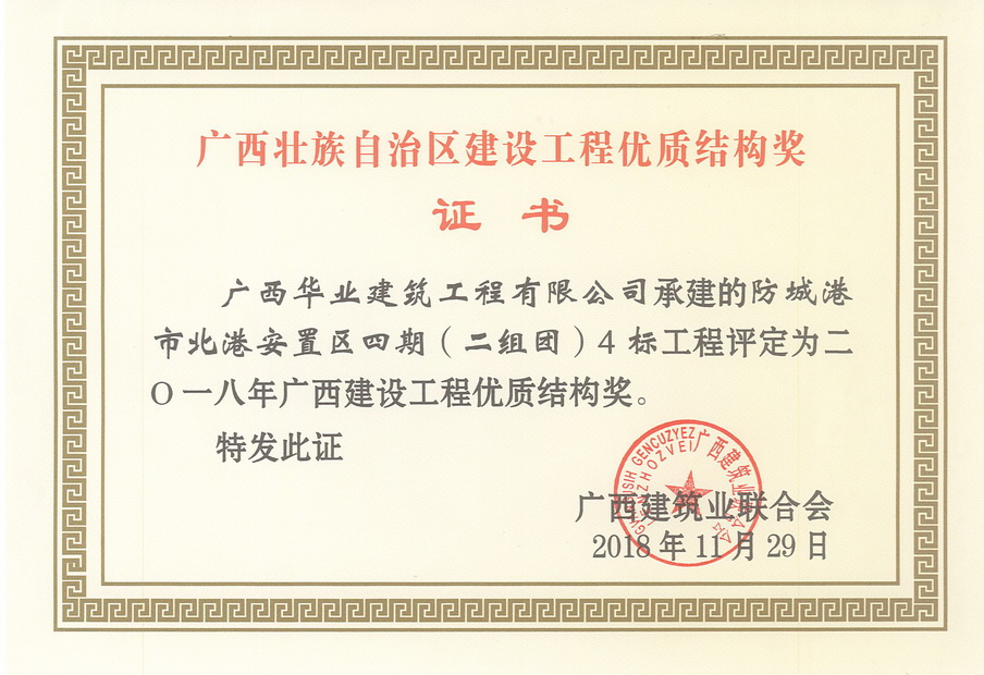 2018.7防城港市北港安置住宅區(qū)四期(二組團(tuán))4標(biāo)工程榮獲2018年上半年廣西..